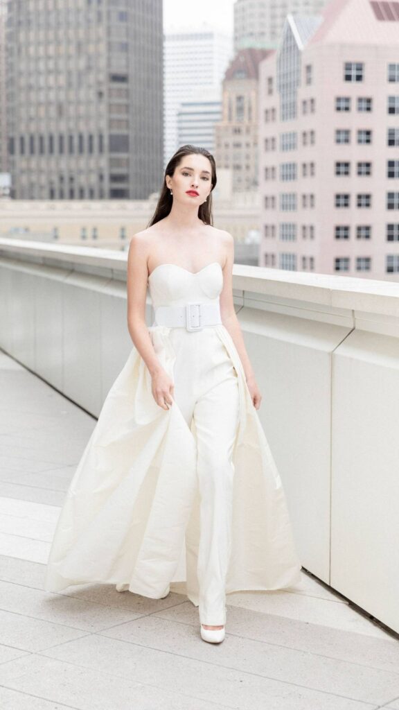 A: Larissa and I had been really wanting to do something creative. After many months isolated inside our homes alone, and with most if not all of our weddings being postponed, we really wanted to get our hands dirty and collaborate on something beautiful. Larissa and I are always talking about creative ideas we have and locations we want to work at, as well as outfits and dresses we wished our clients would wear at real weddings. Styled shoots are ways of trying out new ideas, taking risks and playing with ideas that some clients might not want to risk on their actual wedding day. When the MOMA said they were interested in working with us, it was a no-brainer. With Larissa being a fine arts major and both of us with a huge passion for art and the architecture of the building, we were thrilled to collaborate with them. I had done the first wedding at the MOMA in 2018, and had not been able to really share images of the wedding due to copyright issues with some of the artwork in the photographs, so I was thrilled to get another chance to work at such a historic and magnificent place, with such a wonderful and creative group of collaborators.