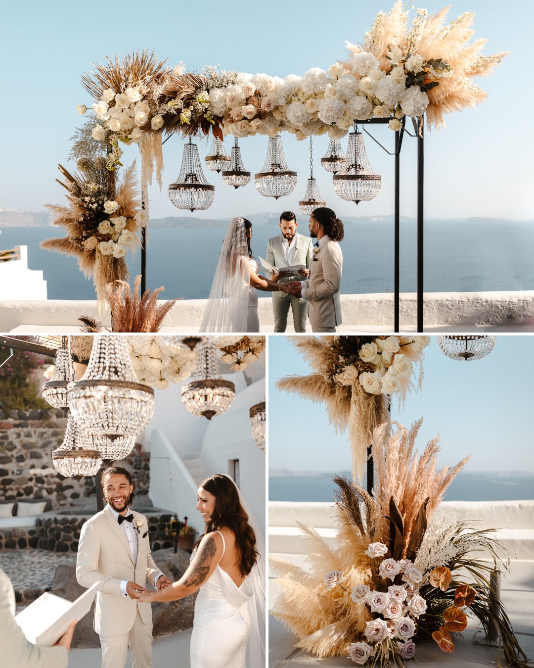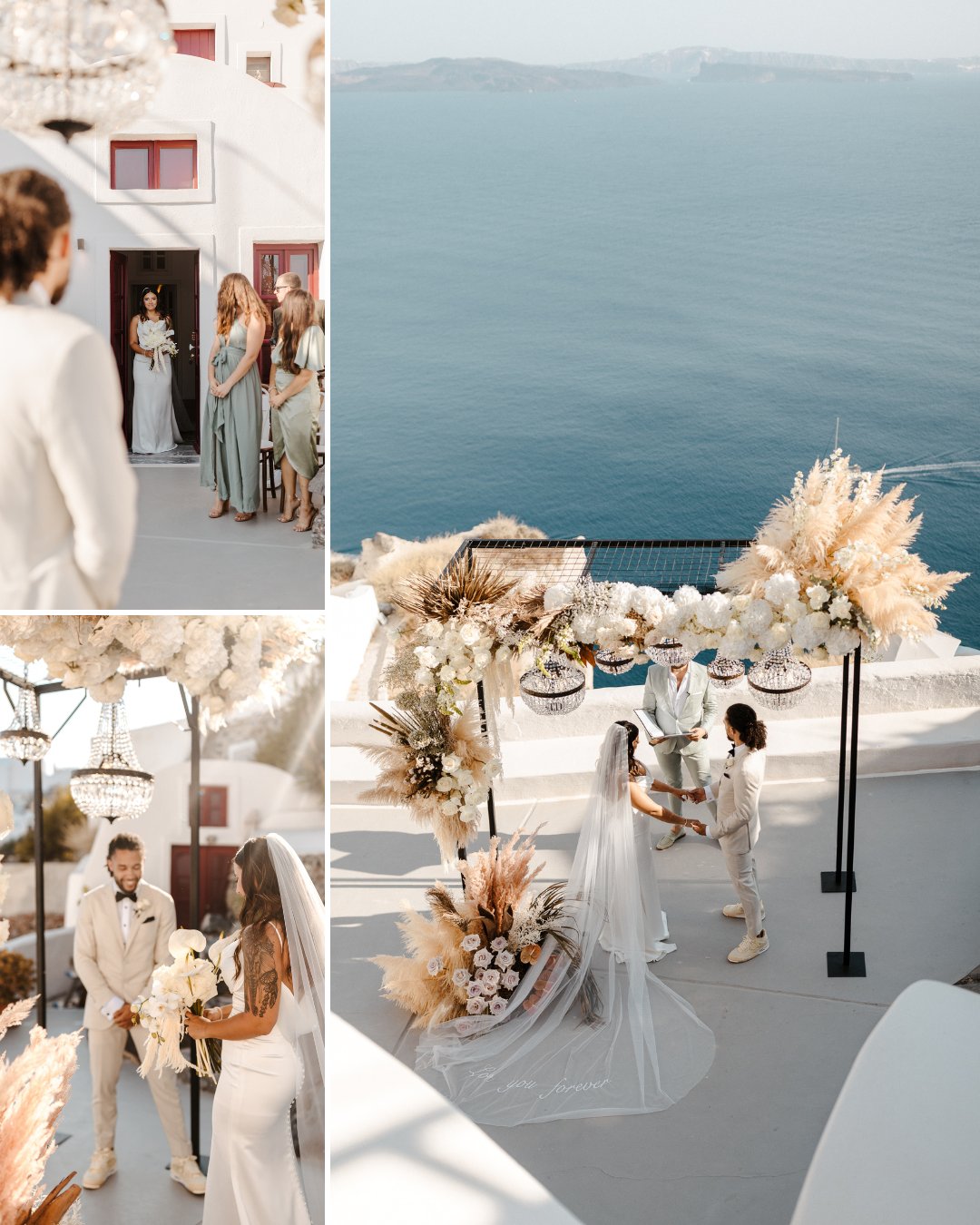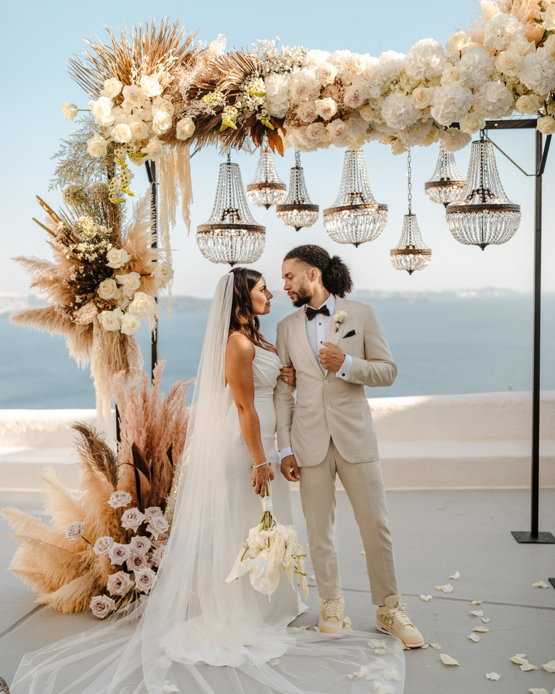 Surrounded by lush blooms from Betty-Betty Flowers, the two exchanged vows on a terrace overlooking the caldera. It was the kind of view that makes you forget to breathe for a second.