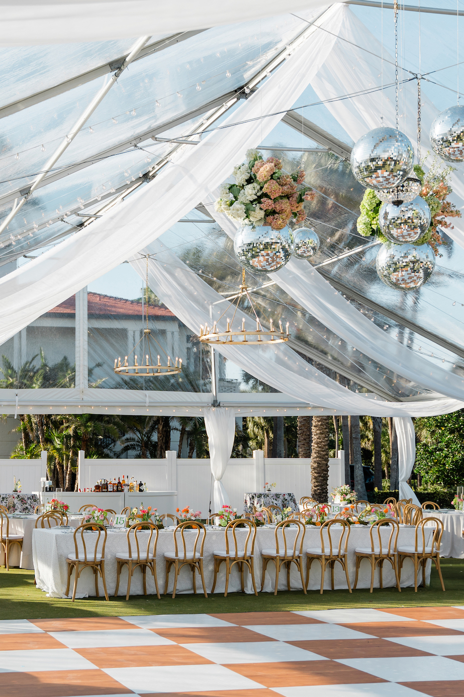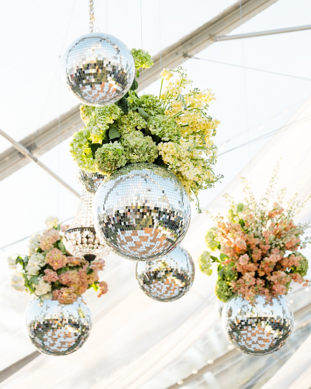 Carolyn and Max made sure no guest left without feeling their love woven into the details. Every seat came with a handwritten note, while hand-painted place cards added an artisanal touch. A custom crest, designed by Carolyn’s cousin, showed up on cups and cocktail napkins. Even the flowers carried meaning, lush blooms mixed with pops of oranges, a nod to their Florida roots. “The hanging floral installation with chandeliers and disco balls was executed superbly,” Carolyn says, still beaming about the show-stopping design from Marble & Pine.