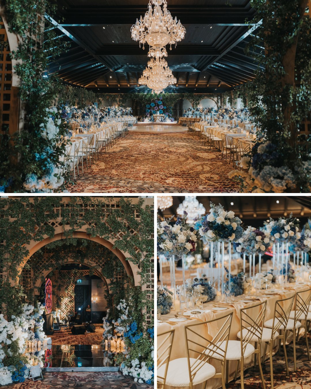 Inside the Candi Ballroom for the reception, designers transformed the vast space into an indoor garden, complete with a gazebo-like sweetheart table and floating floral centerpieces.