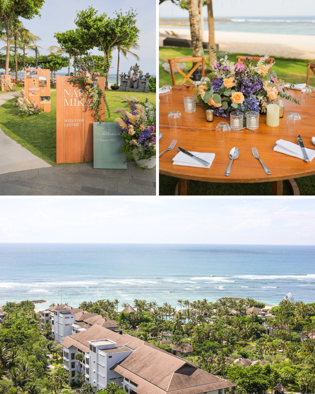 Knowing most guests wouldn’t have time to explore Bali to its fullest, Nap and Mikaela brought the island culture to their celebration. Balinese traditional dancers performed at the welcome dinner, offering a taste of the island’s culture. Welcome kits awaited in every room, filled with local snacks, essentials, and a custom sunblock-insect repellent hybrid crafted by Nap.