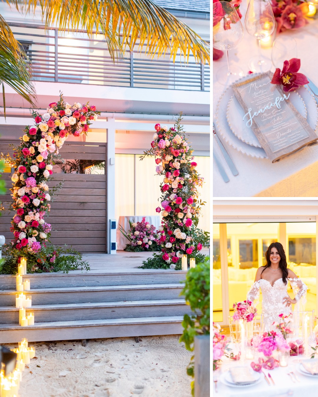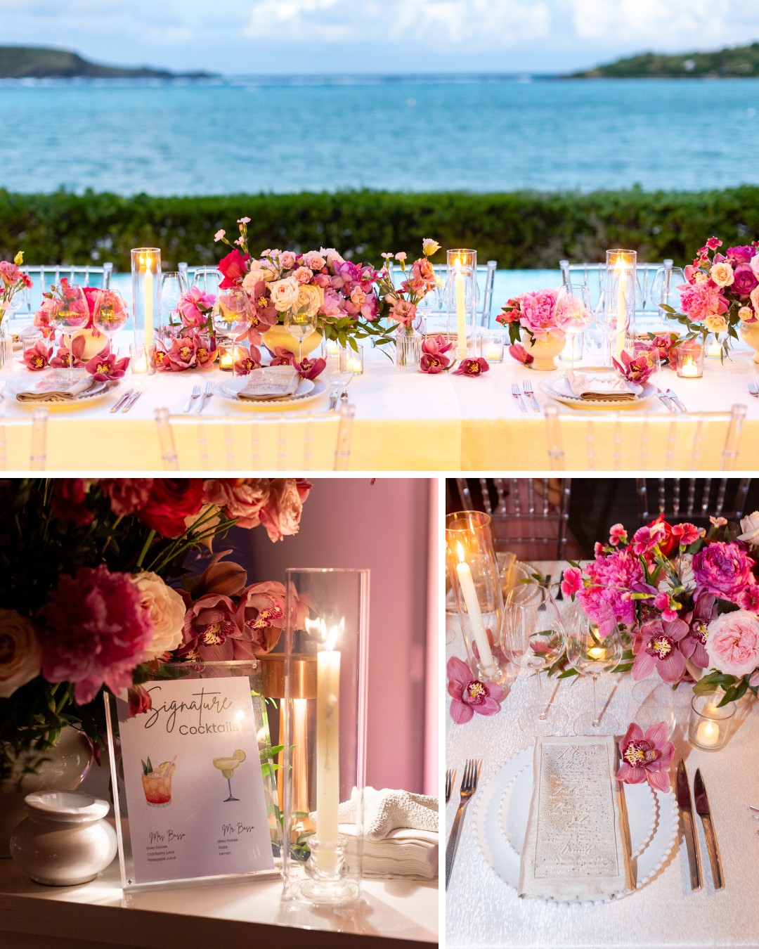 Jennifer’s obsession with florals and tablescapes played a starring role in the wedding design. “My biggest thing was the decor, flowers, and tablescape,” the bride tells us. “For the welcome party, I wanted to go elegant with a minimalist feel. It was all white roses and all candles at sunset.”