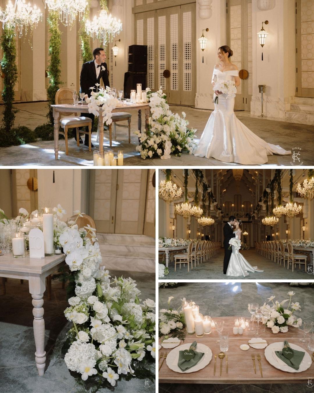 Design followed the same philosophy of presence and customization. Working alongside Jason of Rheefined Company, Angelina’s ideas took shape through constant iteration. “Angelina came up with the idea of chandeliers. Jason came up with the idea of hanging them from the rafters. The decorator turned the concepts into reality.” When the right tables could not be sourced locally, they were built by hand. Florals by Ochic Florals complemented the layered aesthetic, while stationery and paper goods were designed by Velvet Fox Designs, with calligraphy by Katrina appearing on personalized luggage tags that doubled as favors.